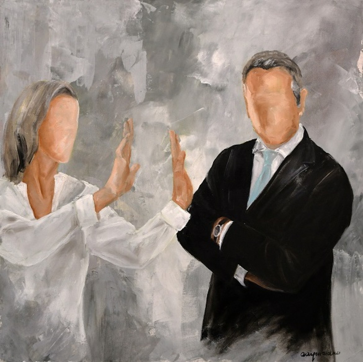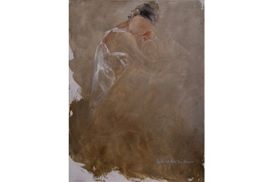 A metafora di questo pensiero, per rimarcarne il concetto, la figura femminile sui miei quadri è quasi ingoiata dal fondo, priva di connotati e caratteri somatici e fa fatica ad uscirne.