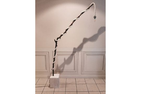 Nasce così l' opera proposta che vuole evocare con elementi semplici la Vita e il suo fluire rappresentati da un cordone (ombelicale) che avvinghiato al ramo di un albero (simbolo di forza e radicamento) sostiene l' elemento LUCE.
